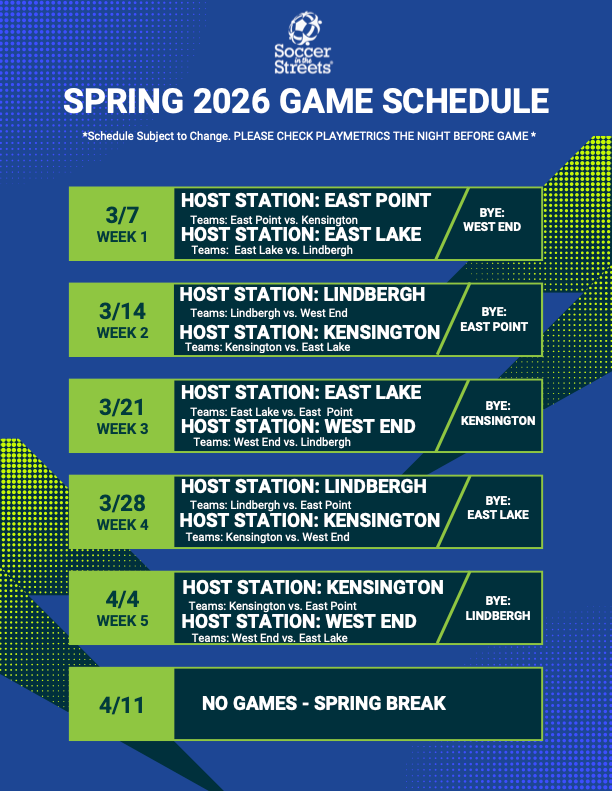 We currently serve five StationSoccer locations - West End, East Point, East Lake, Kensington, and Lindbergh. We also partner alongside schools and community organizations throughout the year. For more information, you can view each locations page or reach out to programs@soccerstreets.org